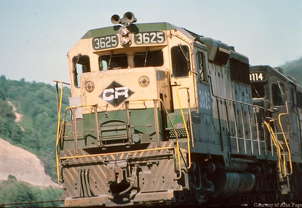 Former RDG GP35 3625 leads GP38-2 8114 across Rockville Bridge in June, 1977.