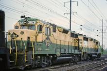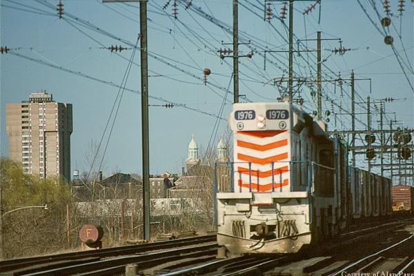 Crudely CR-stenciled ex-RDG GP35 3635 leads all RDG GP35 3628 and a PC U-boat with mixed freight on the NE Corridor at Morrisville in April, 1977.