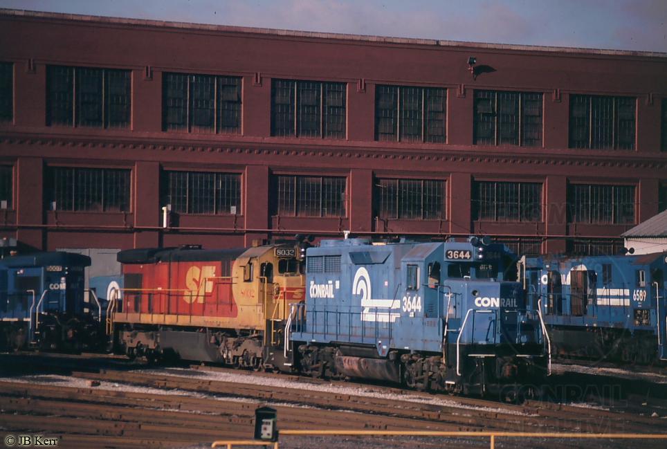 Conrail GP35 3644 (ex-RDG 3644) is seen behind the E&M Shop at Juniata along with a Santa Fe "Kodachrome" C30-7 8032 in April, 1996. Based on the photo date, the aging GP35 is definitely on borrowed time.
