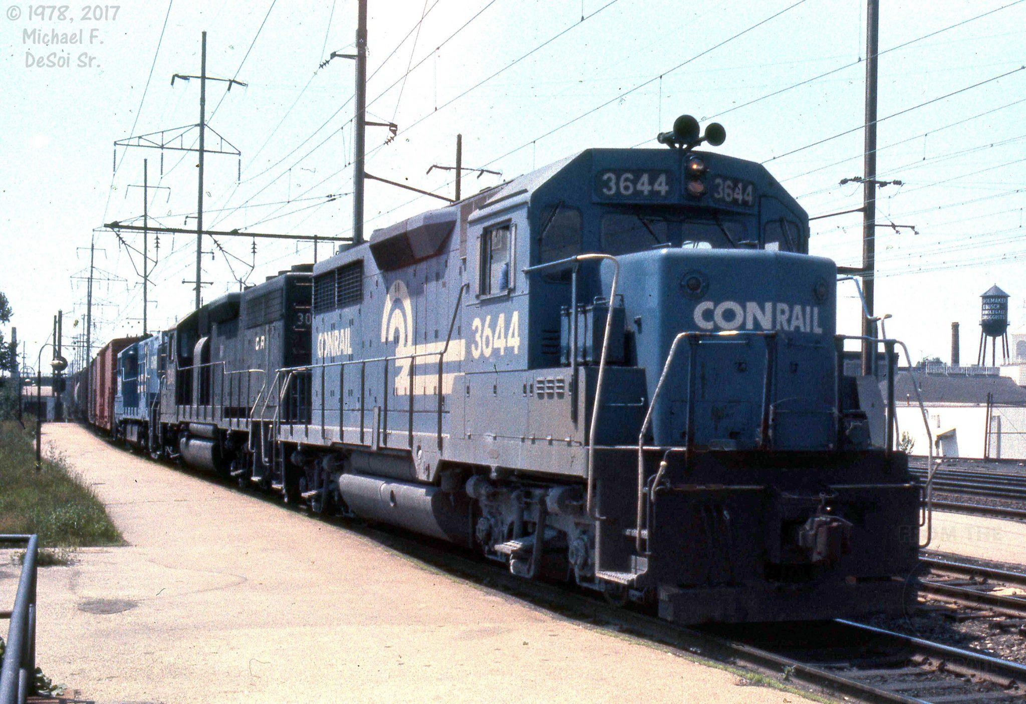 Conrail GP-35 #3644 (ex Reading) leads an eastbound through the station at Frankford Junction in Philadelphia, PA. 1978