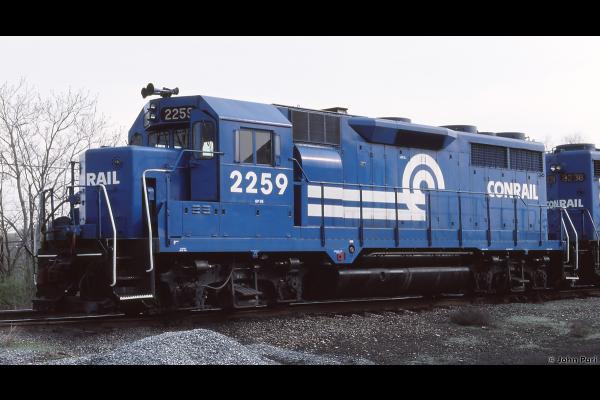Still in RDG livery, CR GP-35 3645 and GP40 3041 wait for orders to pull out of Morrisville yard in March, 1977.