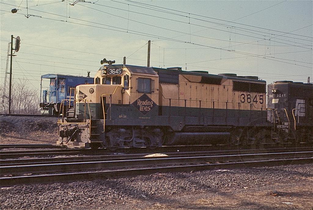 Still in RDG livery, CR GP-35 3645 and GP40 3041 wait for orders to pull out of Morrisville yard in March, 1977.
