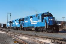 Former RDG 3651 is seen with CR 8117, 7908, and class N21 caboose 21308 at Shiremanstown, PA on 11/24/1988.