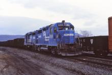 Former RDG 3654 is seen leading a Chessie hopper train into Enola Yard at Summerdale, PA on 1/8/1983.