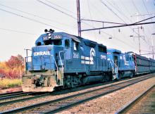 GP-40 #3661 & GE B23-7 #1979 on westbound freight at Adams Station, NJ. October 23, 1984