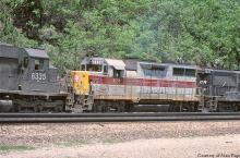 CR SD45 6155 leads SD40 6335, ex-EL GP35 2556 (CR 3662), U25B 2620, and GP38 7661 (ex-PRSL 2001) as they pull hard up Horseshoe Curve on May 22, 1977.