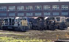 CR GP-35's 3677 (ex-EL 2571) and 3649 (ex-RDG), an unidentified ex-PC Alco C628, GP-38 7862, and other black and blue CR units receive service or parts removal at the Juniata shops in August, 1978.