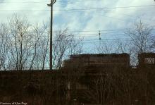 EL GP35 2570-2579 (CR 3676-3685) leads two ex-PC GP's across the overpass at Morrisville yard in March, 1977.