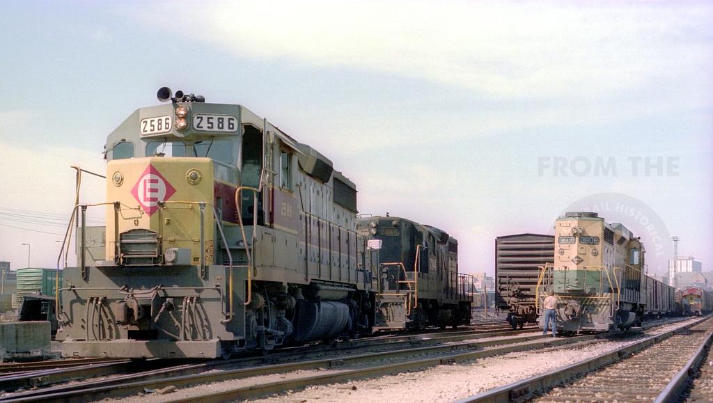 It's April of 1976 in Akron, Ohio as a Conrail crew cuts out the middle unit of an EL/PC/RDG trio. The geep would stay in Akron for local duty while the EL GP35 and RDG GP30 would continue west on the former EL main. The EL unit would become Conrail 3692, the highest numbered GP35 on Conrail.