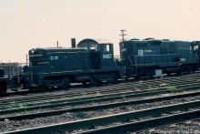 CR SW-1 8487 and GP-9B 3839 in a line of other retired SW-1's at Morrisville yard in June, 1980.
