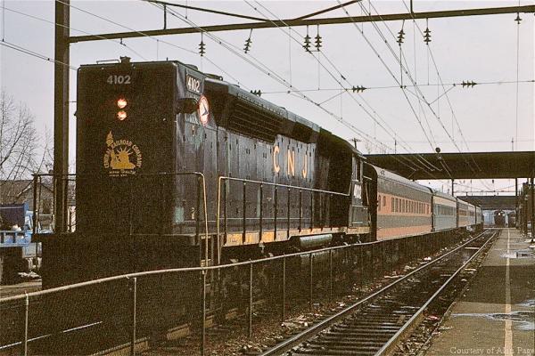CR E-8A 4014 (ex-EL 825) rests with a GP38-2 and other E-units behind the South Amboy engine house in March, 1978.
