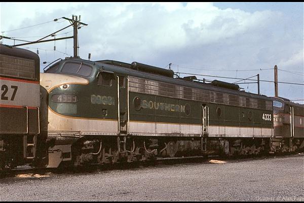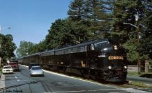 Conrail E8A 4020 is seen powering the Trenton bound Office Car Special street running through Burlington City on a publicity trip for what would become the NJT River Line. 5/31/1996
