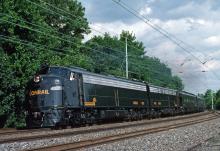 Conrail E8A 4021 is seen leading an OCS-101 west at Rosemont, PA on 6/16/1992