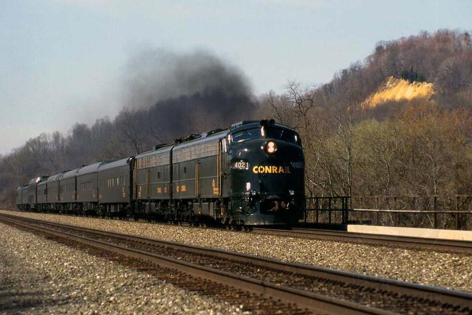 Eastbound E8s put up some smoke as they notch it out on the straight-away west of Lewistown with an Office Car Special on the old PRR main line.