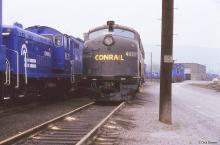 Conrail E8A 4022 is laying over at Enola Yard in 1986 during a tour. SW8 8673 is definitely not used to keeping this kind of company.