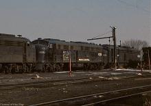 CR E-8A 4039 and former PC 4258 rest in a line of E-units awaiting assignment at the South Amboy engine terminal.