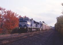 Class unit SD80MAC 4100 leads FRSE across the flats in Hinsdale, MA. on Oct. 4, 1997.