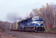 A pair of SD80MAC's, led by the 4104, are eastbound around mile 162.5 in Canaan, NY. on Oct. 17, 1998 with SEBO.
