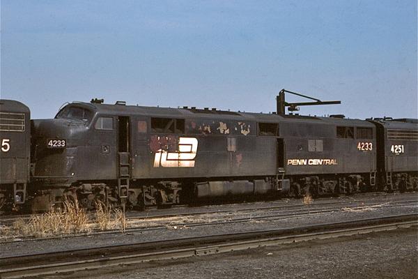 No longer CNJ blue and yellow, CR-operated NJDOT GP40P 4110 (ex-CNJ 3681) waits for assignment at South Amboy in April, 1983 in one of the bright NJ Transit paint schemes of the 1980's.