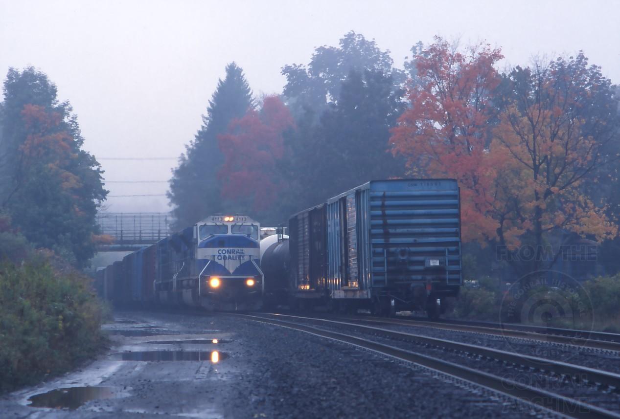 The head end of SEFR passes the rear of SPSE at 09:04 on Oct. 5, 1997 in Hinsdale, MA.
