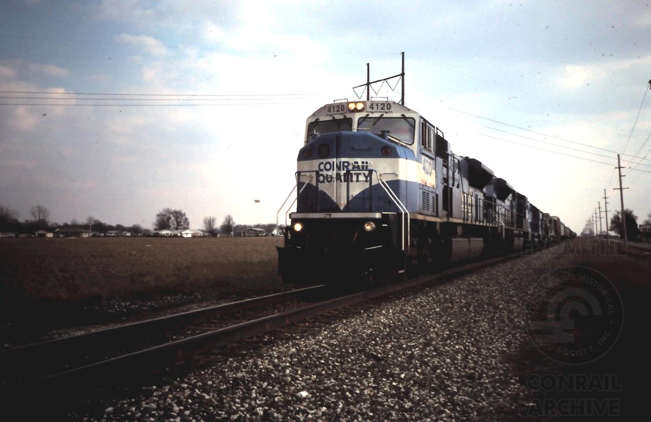 CR 4120, 4127, 2 more CR EMD's, 6617, and a CSX EMD powers TREL-4 northbound on the Marion Branch just south of Milford, IN on April 14, 1997.