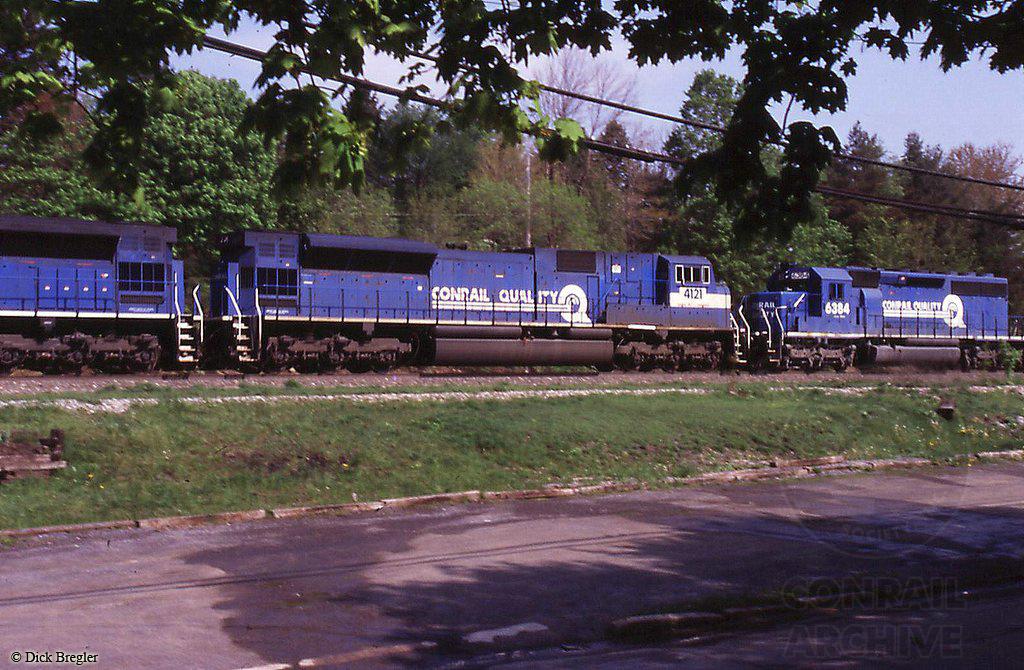 Conrail SD80MAC 4121 is seen on an eastbound freight from the porch of the Station Inn in Cresson, PA in 1998.