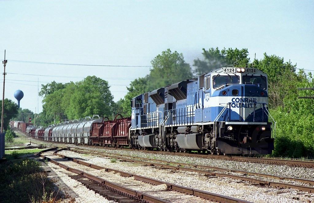 A pair of Conrail SD80MACs head south on the Marion Branch near MP-80 bound for Indianapolis under the symbol ELIN-2a on May 20, 1999. Kevin Nelson photo with permission