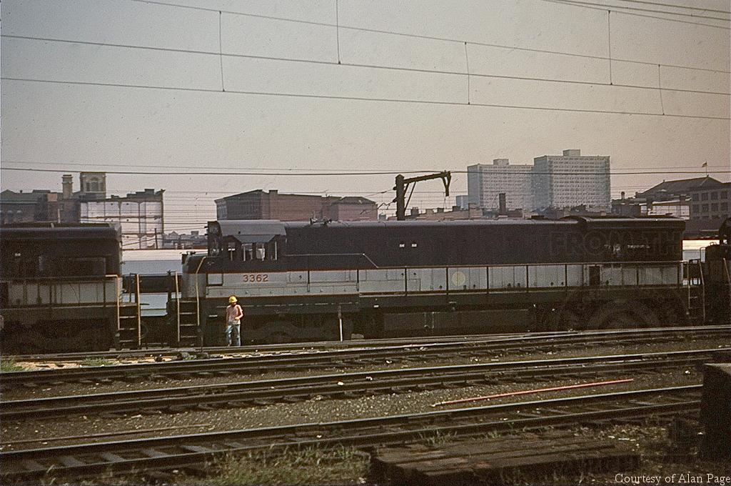 Former EL U34CH 3362 (CR 4162) is in the middle of a trio of CR-operated U34 CH's at Hoboken terminal in August, 1977.
