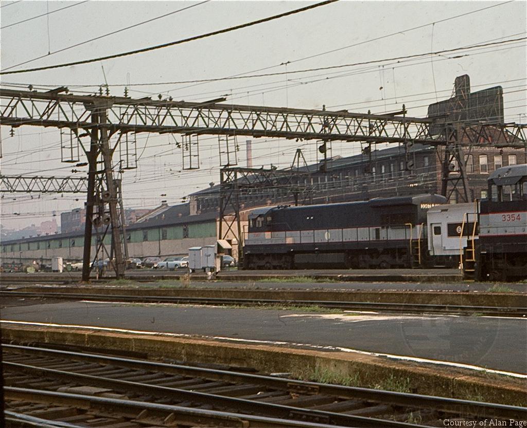 CR-operated former EL U34CH's 3367 (CR 4167) and 3354 (CR 4154) ready for departure from Hoboken terminal in August, 1977.
