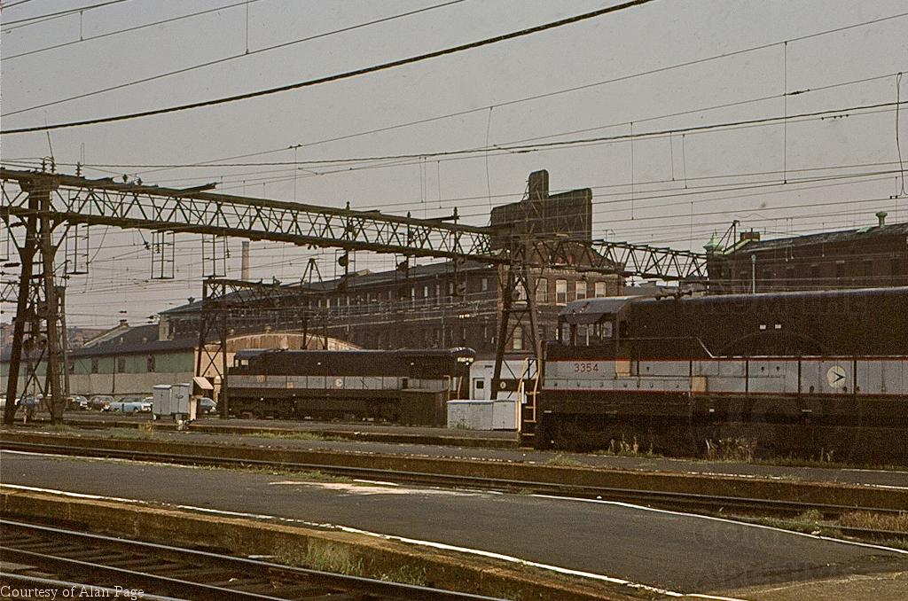 CR-operated former EL U34CH's 3372 (CR 4172) and 3354 (CR 4154) prepare to depart Hoboken Terminal in August, 1977.