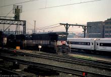 EL U34CH 3374 and a sister unit rest at the engine terminal at Hoboken in August, 1977.