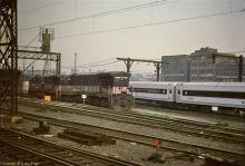 A pair of CR-operated former EL U34CH's, with 3374 (CR 4174) second, prepare for their train out of Hoboken terminal on August 5, 1977.