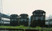 A trio of CR-operated former EL U34CH's (CR roster 4176, 4159, and 4175) lined up ready for their train assignments at the Hoboken engine terminal in August, 1977.