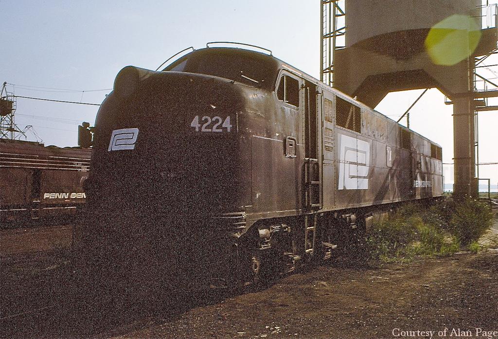 Late in the day at South Amboy, PC E-7A 4224 rests behind the engine shops in July, 1977.