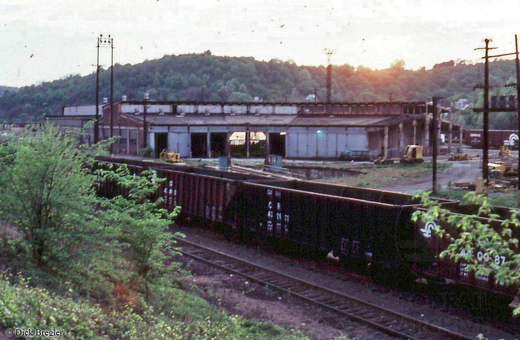 A 1982 view of the old Pitcairn locomotive facilities shows Conrail triple hopper 422972, among others.
