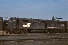Still in PC lettering but looking worn and needing paint, CR-operated E-7A 4233 sits in a line of E-units at South Amboy in March, 1978. The E-7 has about a year left before retirement.