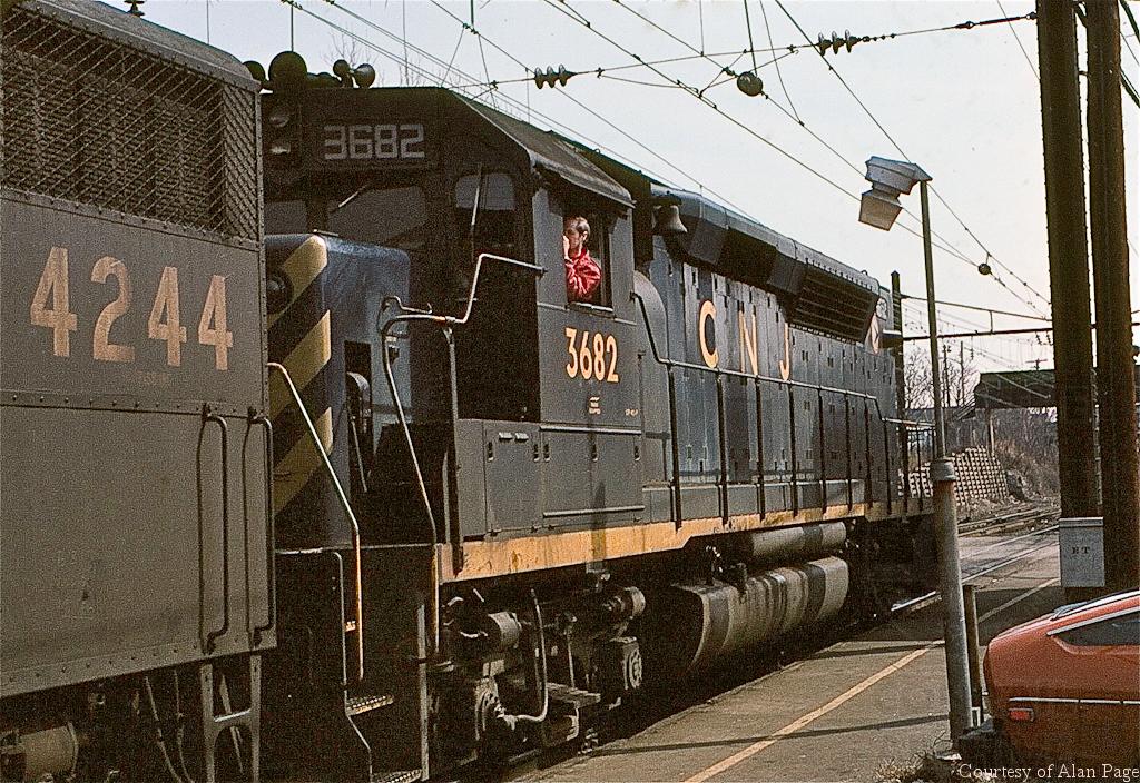 CR E-7A 4244 and GP40P 3682 (CR 4111) couple onto a string of PRR coaches at South Amboy station on March, 11, 1978.