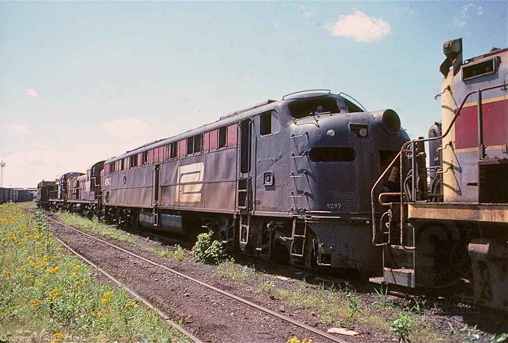 Former PC E-8A 4247 rests retired in the Juniata shops deadline in August, 1977.