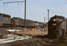 CR-operated former PC E-8As 4249 and 4320 (ex-PC, rebuilt by GE 5/1977) lined up behind GP40 3190 at the South Amboy engine terminal in March, 1978.