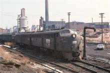 CR-operated former PC E-8A 4253 sits by the steam-era water plug at the head of a line of E-units at South Amboy in March, 1978.