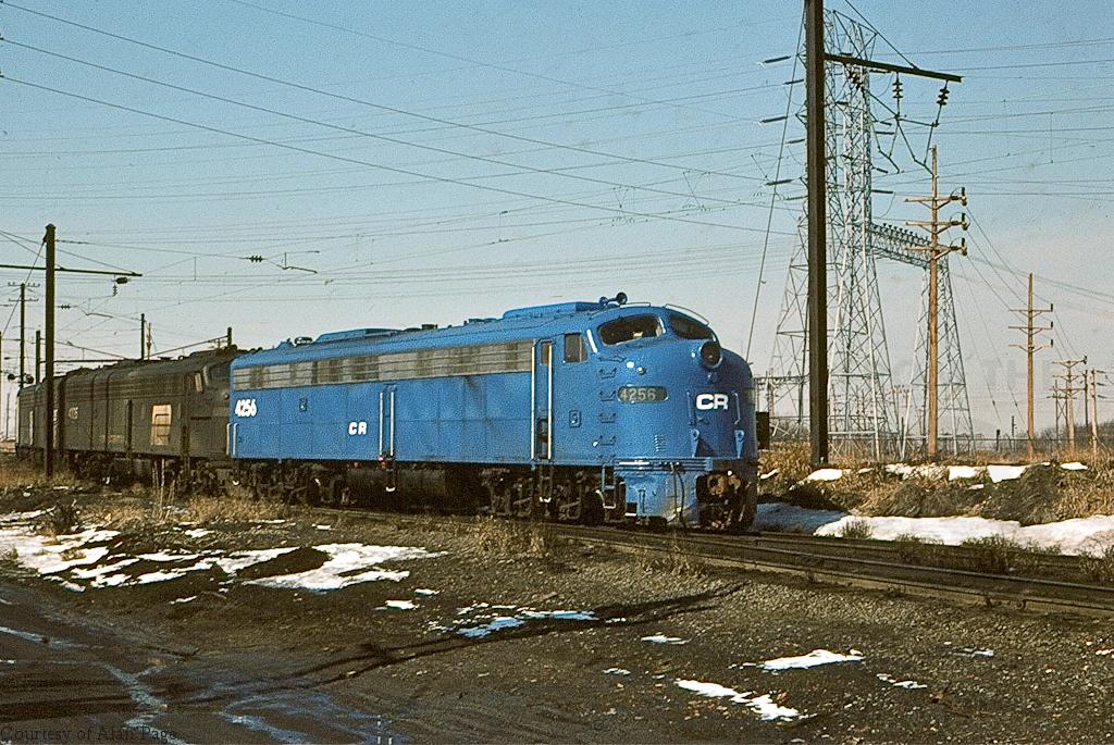CR E-8A 4256 leads former PC E-8A's 4326 and 4267 into South Amboy engine terminal in March, 1978.