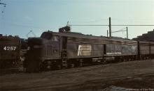 Late in the day on July 10, 1977, CR-opearated former PC E-8A 4285 rests at the busy South Amboy engine terminal.
