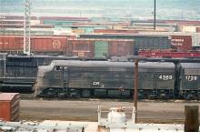 Previous Next With ancient PRR 40' boxcar 87243 behind, ex-PC FP-7 4369 and F-7A 1729 wait for assignment at Conway yard in August, 1977. Photo By Alan Page Year 1977 Original Date 8/8/77 Location City Conway PA Location Details Conway yard Equipment Type EMD F7 Predecessor Paint Scheme PRR Collection CRHS Conrail Photo Archive Contributions