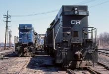 CR E-44 electrics 4446 and 4401 lead rows of stored sister units at Rutherford in April, 1984.