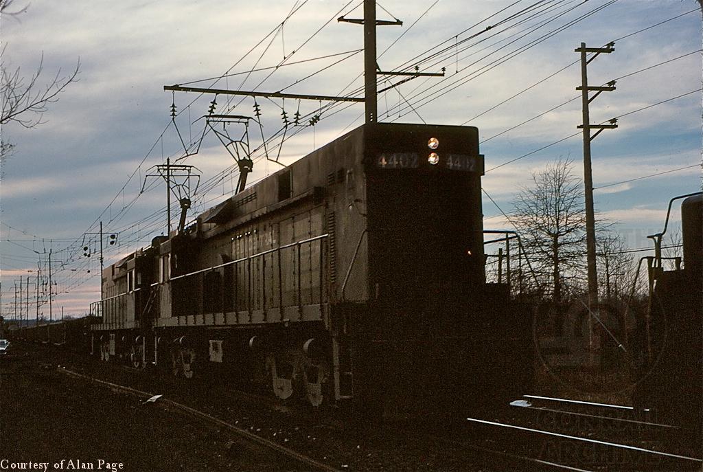 PC E-44 4445 takes up the rear in a duo of electrics pulling freight towards Morrisville near Willow Grove in March, 1977.