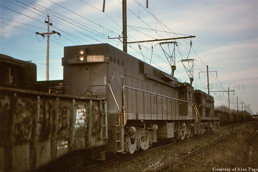 PC E-44's 4402 and 4445 roll eastbound with a mixed freight at Willow Grove in March, 1977. Waiting to head westbound are PC GP30 2241 and GP7 5814 with a line of hoppers.