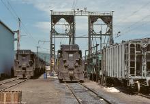 Still showing PC heralds, E-44 electrics 4404 and 4452 rest at the Enola engine terminal in May, 1977.