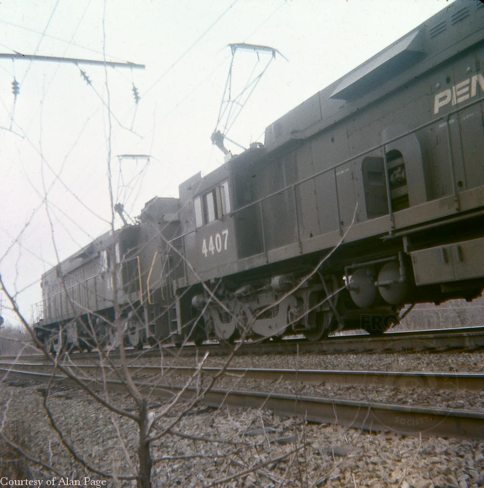 A pair of E-44 electrics, PC 4410 and 4407, pause with a mixed freight on the Trenton Cutoff at Willow Grove in December, 1976. The lesser quality photo was taken with an ancient Kodak Brownie camera using large format Ektachrome slide film.