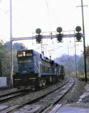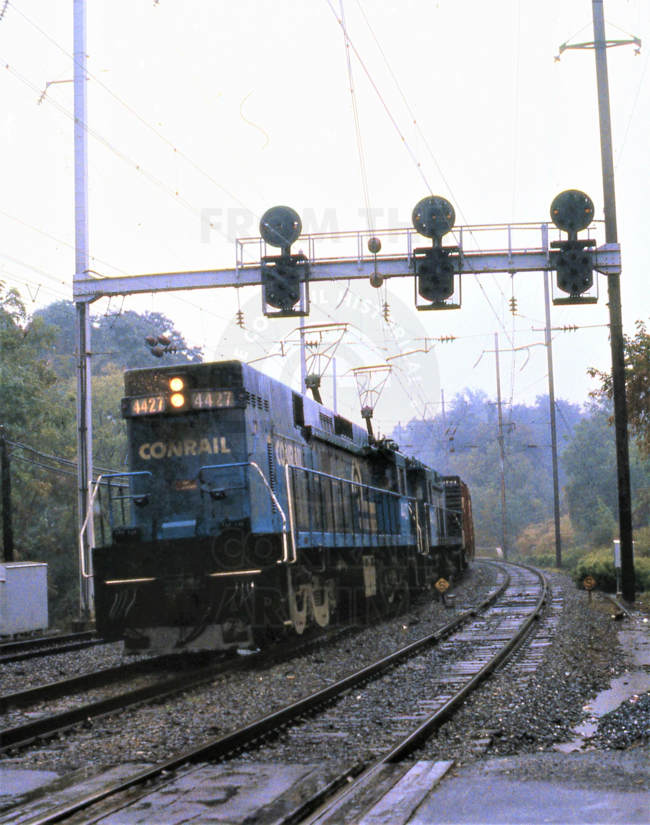 Conrail. E-44 #4427 on eastbound freight at West Fairview, PA east of Enola, PA on rainy September 16, 1979