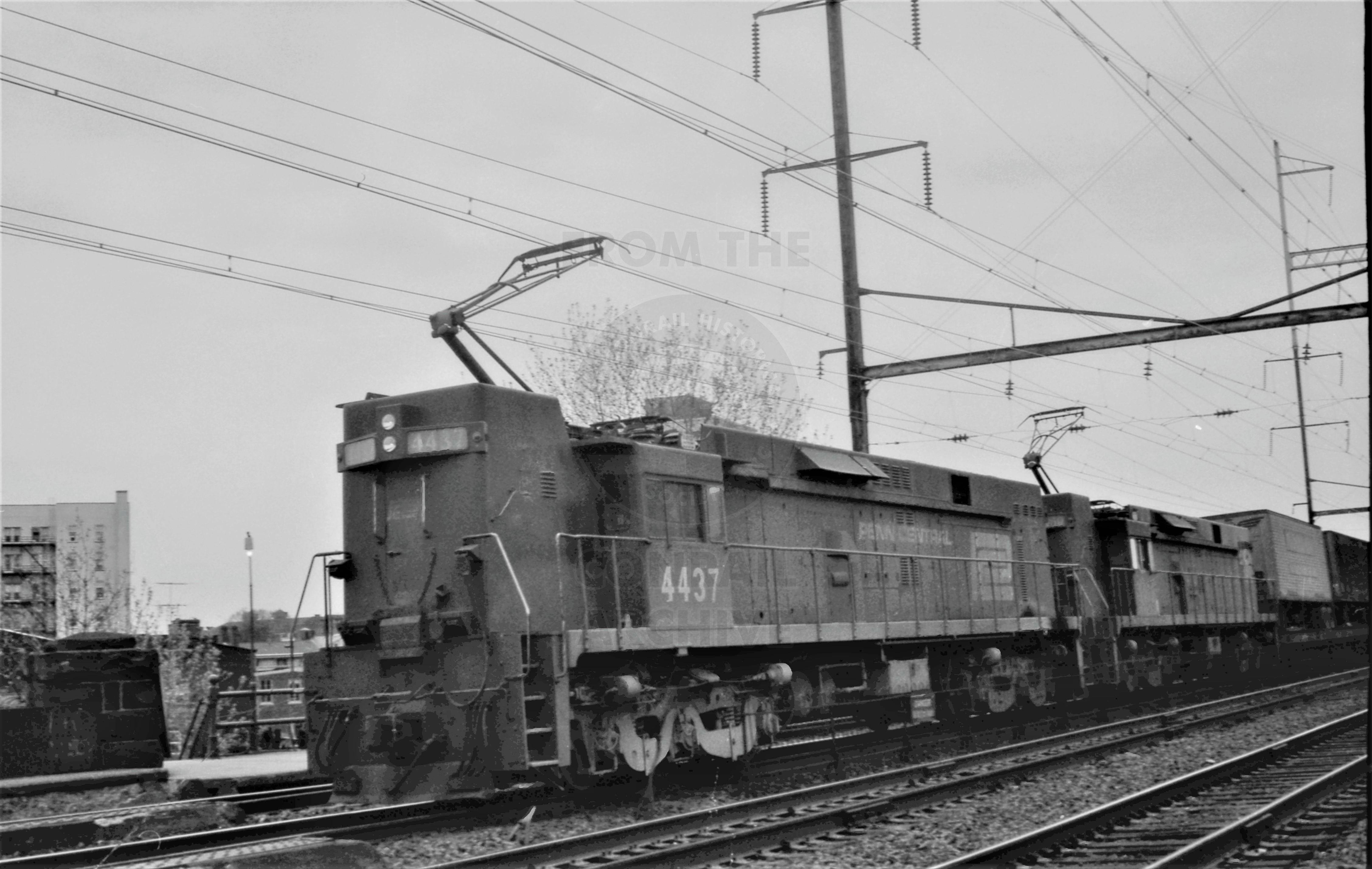 CR. Ex Penn Central E-44 #4437 & other with eastbound freight at New Brunswick, NJ. April 24, 1976. I believe this was my first Conrail photo since the Conrail take over. I used a view finder 35mm camera in those days with Kodak Pan-X black & white film.